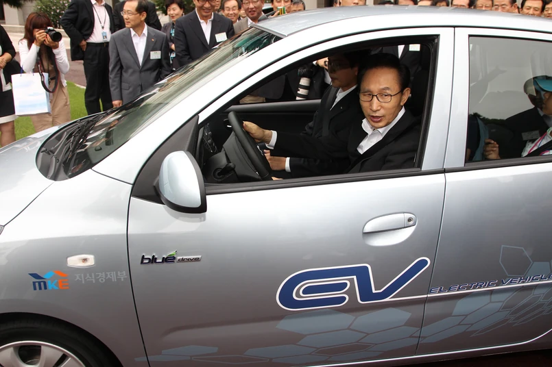 Prezydent Korei Płd. Lee Myung-Bak za kierownicą elektrycznego samochodu BlueOn koncernu Hyundai Motor Co podczas prezentacji, która odbyła się 9 września w Seulu (1).