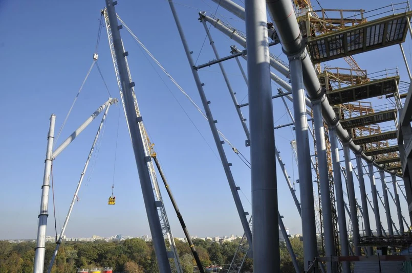 Montaż „jedynek” był skomplikowanym procesem – trudny kształt połączonego zespołu, zastrzału i odciągu, był powodem, że montaże musiały być wykonane przy użyciu dwóch żurawi - mówią przedstawiciele Narodowego Centrum Sportu.
