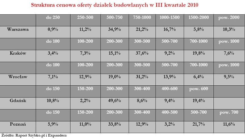 "W Warszawie nadal najłatwiej jest znaleźć działkę w przedziale cenowym od 500 do 750 złotych za metr, stanowią one niemal 35 proc. oferty. W Krakowie i Wrocławiu najwięcej ofert mieści się w przedziale od 300 do 500 złotych za metr kwadratowy, a w Gdańsku i Poznaniu od 200 do 300 złotych" - uściśla Marta Kosińska, ekspert Szybko.pl