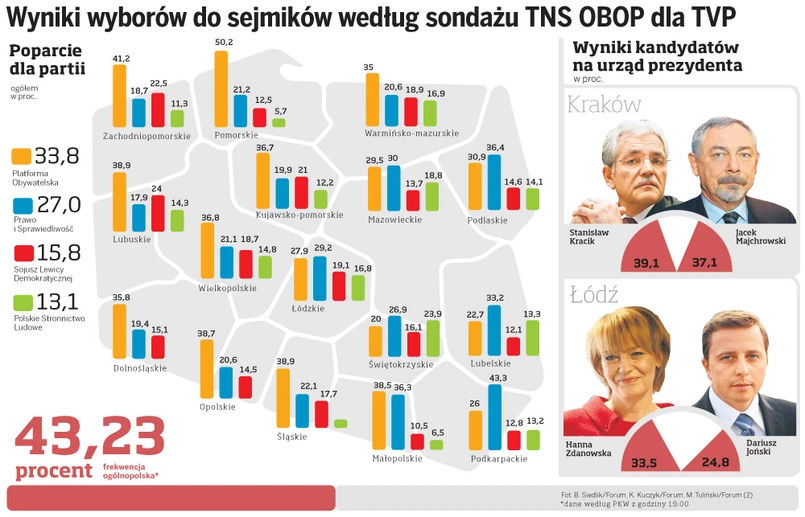Frekwencja w wyborach do sejmików wojewódzkich wyniosła 43,98 proc. Do chwili obecnej nie ustalono wyników wyborów w żadnym z 16 sejmików województw.