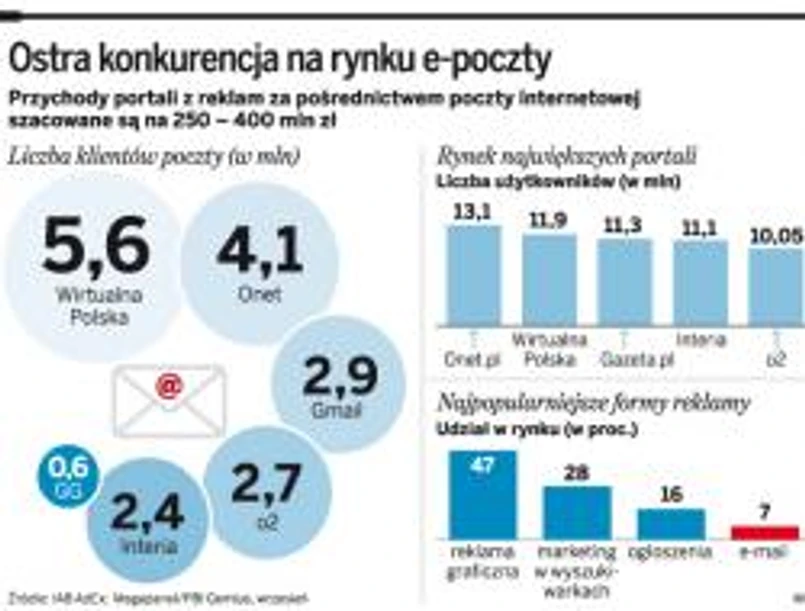 Do kampanii promującej usługi pocztowe szykuje się największy portal w polskim internecie – Onet.pl – dowiedział się „DGP”. Właśnie wprowadził do usługi pocztowej kilkanaście nowinek, które mają poprawić szybkość i dają możliwość używania poczty m.in. na urządzeniach przenośnych. Onet integruje także pocztę z kalendarzem i kontaktami oraz likwiduje limity pojemnościowe skrzynek.