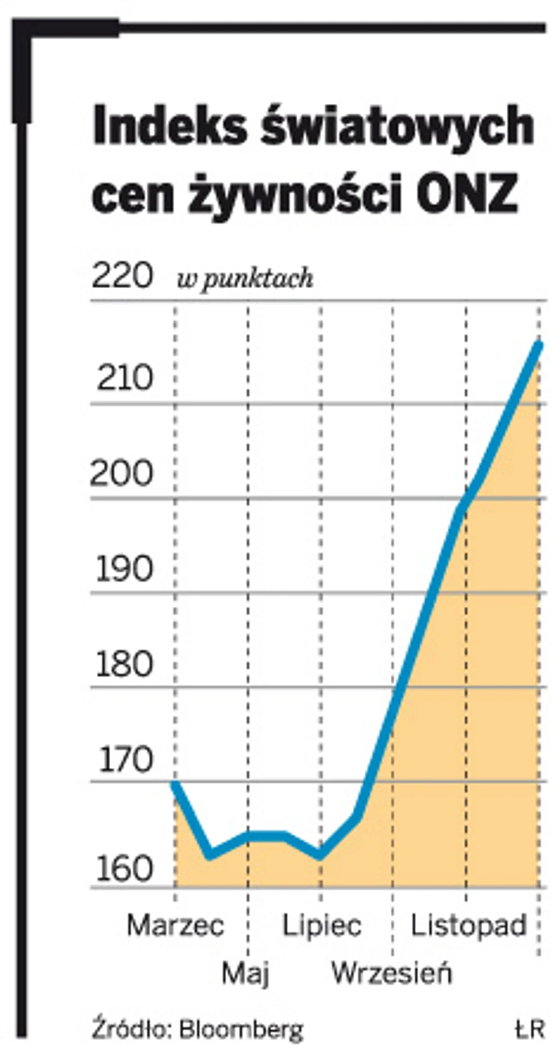 Według najnowszych danych Organizacji Narodów Zjednoczonych pod koniec ubiegłego roku wskaźnik obejmujący ceny 55 podstawowych produktów spożywczych osiągnął poziom 214,7 punktów. Najwyższy od początku lat dziewięćdziesiątych, od kiedy ONZ prowadzi badania. To też więcej niż dwa lata temu (213,5), kiedy szybko drożejąca żywność sprowokowała głodowe rewolty w Azji, Ameryce Środkowej i w Afryce. W zamieszkach wzięło wtedy udział łącznie ok. 100 mln ludzi w 25 państwach. Eksperci obawiają się, że w tym roku sytuacja może być równie dramatyczna, bo nic nie wskazuje na to, że wzrost cen wyhamuje. – Bylibyśmy naiwni, sądząc, że zatrzymają się na tym poziomie – przyznaje Abdolreza Abbassian, sekretarz Światowej Organizacji Żywności.