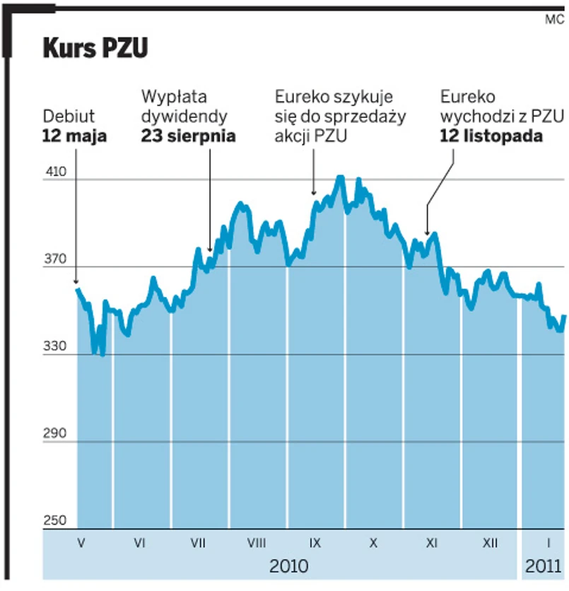 PZU nie jest jedyną spółką, która po spektakularnej prywatyzacji w 2010 roku obecnie mocno tanieje. Spada także wycena papierów Giełdy Papierów Wartościowych, której IPO miało miejsce w połowie listopada. Akcje GPW były sprzedawane po 43 zł, a podczas debiutu ich cena wzrosła aż o 25 proc., do 54 zł. Od tego momentu cena walorów giełdy systematycznie spada. Najtańsze były 10 stycznia, kiedy kosztowały 47 zł. Wczoraj było to ponad 48 zł.