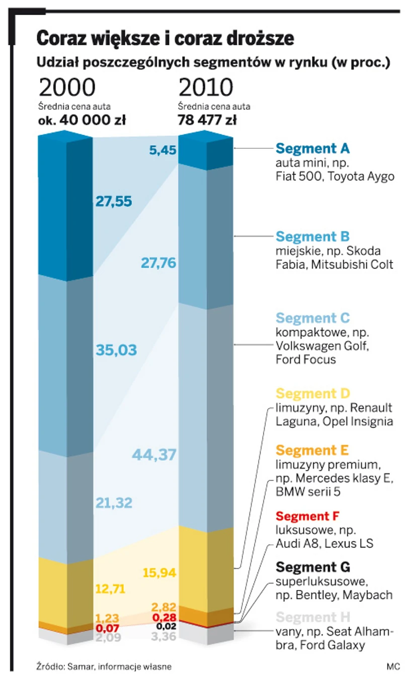 Znacznie większą rolę w podwyższeniu średniej ceny samochodu odegrało to, że w miarę bogacenia się zaczęliśmy przesiadać się do większych, lepiej wyposażonych samochodów. Podczas gdy w 2000 roku segment A, czyli najtańszych i najmniejszych samochodów, miał ponad 27-proc. udział w całym rynku, to w ubiegłym roku skurczył się do skromnych 5,5 proc. W tym czasie Polacy przesiedli się do aut nie o jedną, ale o dwie klasy lepszych. Segment C, czyli auta kompaktowe, w ciągu minionej dekady zwiększył swój udział w rynku ponaddwukrotnie – z 21,3 do niemal 45 proc. Prawie 16 proc. całego rynku stanowią dziś limuzyny segmentu D.