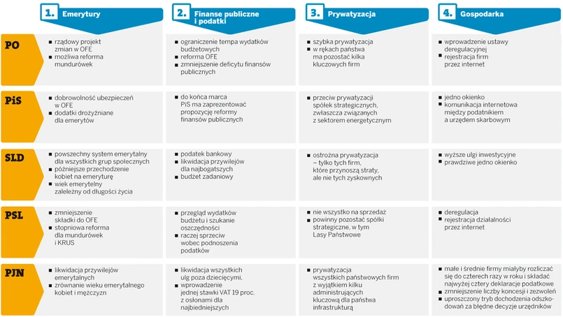 Kilka dni temu swój program przedstawiła PJN. Jeszcze wcześniej pierwszą część propozycji dotyczących zwłaszcza systemu emerytalnego zaprezentował PiS. Partia Jarosława Kaczyńskiego idzie do wyborów z hasłem patriotyzmu gospodarczego. Wkrótce ma przedstawić także pakiet dla przedsiębiorców. Na razie niewiele wiadomo o programie PO. – Będzie on zbieżny z działaniami rządu – mówi nam jeden z polityków Platformy.