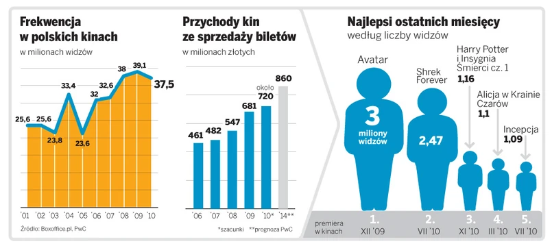 „Avatar” z blisko 3 mln widzów, „Shrek Forever” z 2,5 mln i „Harry Potter i Insygnia Śmierci cz.1” z 1,16 mln sprzedanych biletów – to hity 2010 r. w naszych kinach. Granicę miliona widzów udało się przekroczyć sześciu produkcjom, a w 2010 r. sprzedano łącznie 37,5 mln biletów. Ale to o 4 proc. mniej niż w rekordowym 2009 r., gdy Polacy do kin wybrali się 39,1 mln razy.