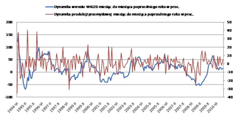 Najbardziej interesujące są jednak analogie dotyczące zmian dynamiki WIG20 i dynamiki produkcji przemysłowej. Od 1994 roku szczyt dwunastomiesięcznej dynamiki indeksu największych spółek pojawiał się w tym samym czasie (marzec i maj 2004 roku) lub nieznacznie wyprzedzał pojawienie się lokalnego maksimum dynamiki produkcji przemysłowej. Analogiczna prawidłowość występuje w przypadku dołków obu parametrów. Giełdowy indeks wyprzedza dynamikę produkcji przemysłowej średnio o trzy, cztery miesiące.