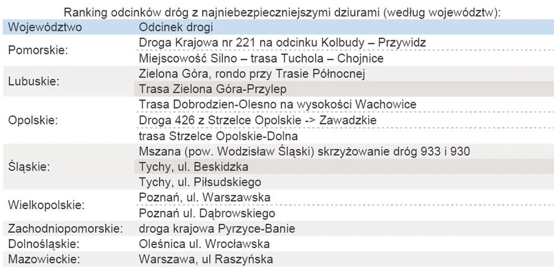 „Już przy pierwszych roztopach znacznie wzrasta liczba zgłaszanych szkód komunikacyjnych, spowodowanych wpadnięciem w dziurę. Najczęstsze uszkodzenia pojazdu to problemy z zawieszeniem, a w szczególności układem jezdnym oraz amortyzatorami. Uszkodzeniom ulegają również felgi i opony, które odkształcają się lub pękają pod wpływem uderzenia” – mówi Tomasz Piotrowski z Sopockiego Instytutu Ubezpieczeń.