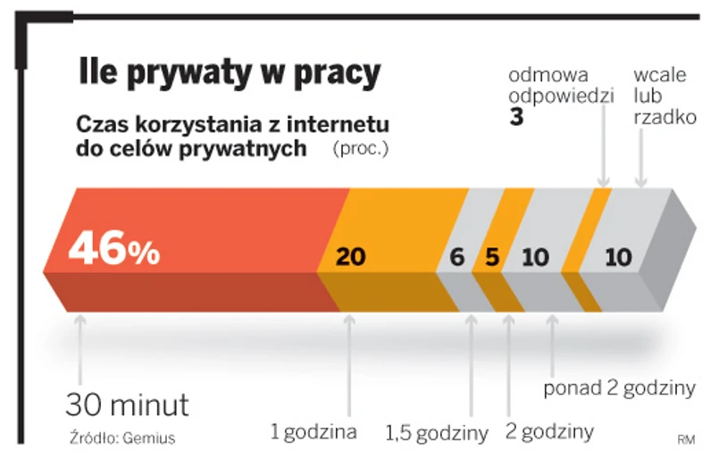 Do cyberslackingu przyznaje się aż 93 proc. pracowników. Blisko dwie trzecie (74 proc.) nie uważa, by było to naganne. Dla 57 proc. sieć stanowi przerwę w wykonywaniu obowiązków zawodowych, a jedynie 20 proc. jest zdania, że tego typu zajęcie może mieć wpływ na jakość wykonywanej pracy. To wnioski z raportu zajmującej się badaniem internetu firmy doradczej Gemius.