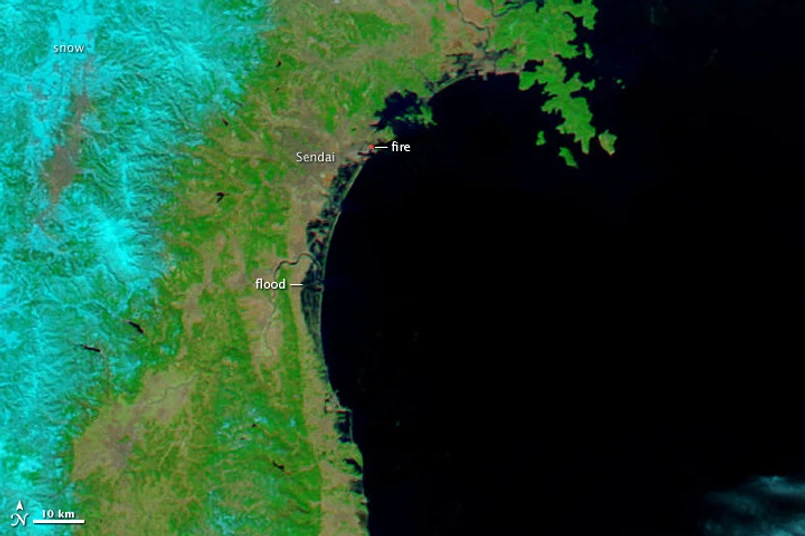 Zdjęcie tsunami zostało wykonane 13 marca 2011 roku. Dzięki temu, że niebo było bezchmurne możemy wyraźnie zobaczyć, jak daleko na ląd wdarła się woda. Woda (na zdjęciu w kolorze granatowym) pokrywa ląd do 5 km od linii brzegowej.