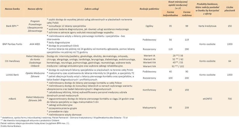 Poszukiwania atrakcyjnych ubezpieczeń zdrowotnych najlepiej zacząć od banku. Zwykle są one tam znacznie tańsze niż bezpośrednio w firmie medycznej. Aby je kupić, wystarczy mieć w banku konto lub kartę kredytową. Takie usługi są dostępne w BNP Paribas Fortis, Lukas Banku, Nordei, Citi Handlowym i w bankach grupy BRE, czyli mBanku i Multibanku. Ostatnio z ofertą pakietów medycznych wystartował Polbank – najtańszy kosztuje 25 zł miesięcznie, bez dodatkowych opłat oraz skierowania gwarantuje wizyty u lekarzy sześciu specjalności. Jeśli klient chce ochroną medyczną objąć całą swoją rodzinę, za pakiet zapłaci 55 zł.