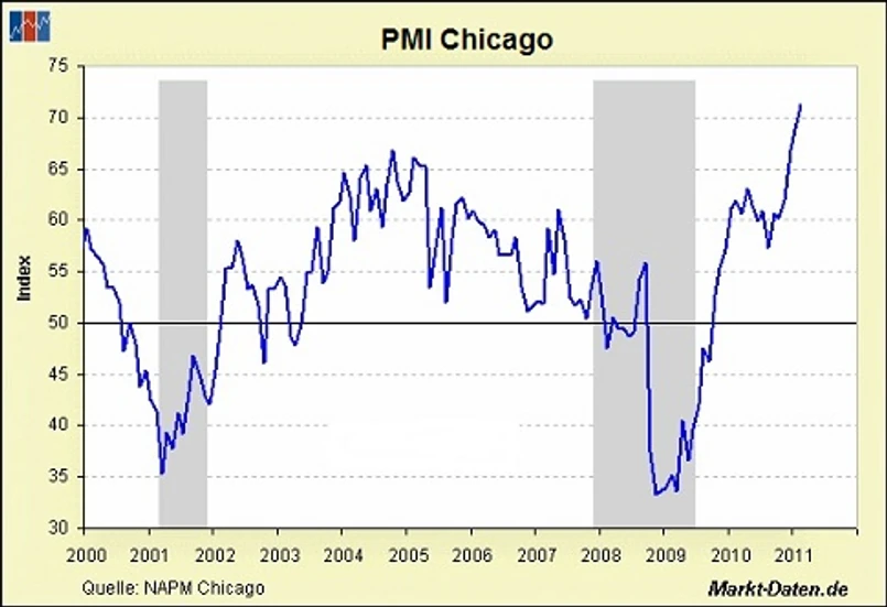 Później nastąpiło dynamiczne odbicie i w kwietniu 2010 roku odczyt indeksu wyniósł 63,1 pkt. Zawirowania fiskalne w Strefie Euro a także spadek dynamiki wzrostu gospodarczego w Stanach Zjednoczonych spowodowały niewielki spadek indeksu, jednak IV kwartał przyniósł odreagowanie i na koniec lutego 2011 roku indeks osiągnął 71,2 pkt. Jak widać pieniądze, jakie zostały wprowadzone na rynek w wyniku polityki luzowania ilościowego pomogły w ożywieniu gospodarki amerykańskiej i poprawiły nastroje wśród menedżerów. Jednak może być to tylko chwilowa poprawa.