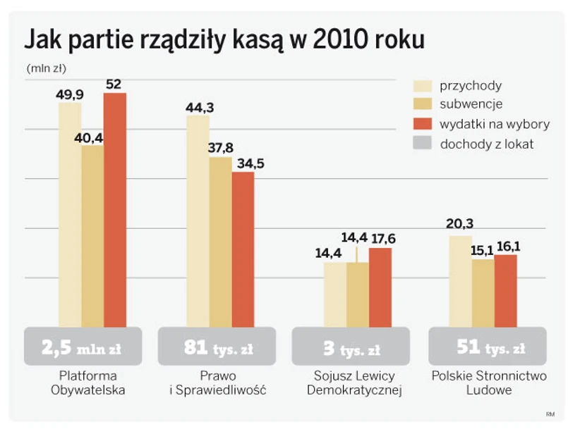 Ze sprawozdań wynika, że najbogatszą partią jest PO. Jej ubiegłoroczne przychody wyniosły ponad 49 mln zł, ale to i tak mniej, niż wydała ona na dwie kampanie: prezydencką i samorządową. Pochłonęły one 52 mln zł. Także inne partie wydawały na ten cel więcej, niż wynosiły ich przychody – wspomagały się oszczędnościami z poprzednich lat i wpłatami sympatyków.