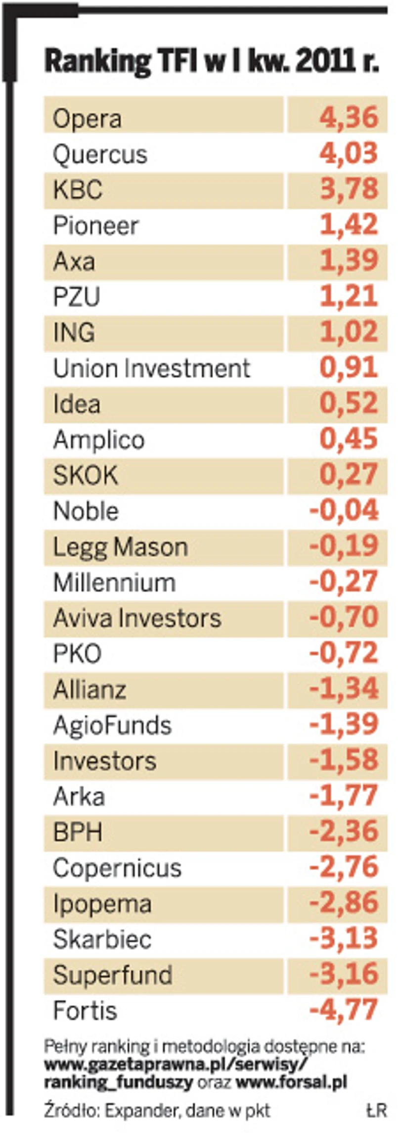 W rankingu TFI na pierwsze miejsce wskoczyła Opera, z wynikiem 4,36 pkt. Na drugim uplasował się Quercus z wynikiem 4,03 pkt, a na trzecim, z rezultatem 3,78 pkt, KBC. Na drugim końcu rankingu znalazły się Skarbiec, Superfund oraz Fortis, okupujące trzy ostatnie miejsca tabeli.
