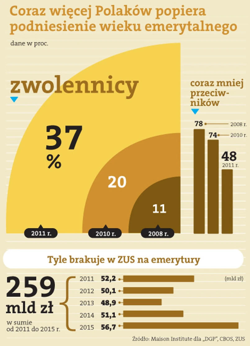 Akceptacja dla przedłużenia wieku emerytalnego rośnie w miarę, jak w Polsce przybywa ludzi z wyższym wykształceniem i wiedzą o zasadach wypłaty świadczeń. Coraz więcej osób zdaje sobie sprawę, że społeczeństwo się starzeje i wczesne odchodzenie z rynku pracy może doprowadzić do załamania systemu emerytalnego. Polacy zrozumieli też, że im dłużej będą pracować, tym większą wypłatę na starość będą dostawać.