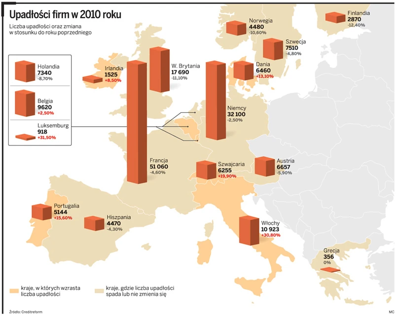 W zeszłym roku, wbrew oczekiwaniom ekonomistów, nie doszło w Europie do wyraźnego spadku liczby upadłości. W krajach piętnastki (plus Norwegia i Szwajcaria) odnotowano, jak podaje wywiadownia gospodarcza Creditreform, w sumie nieco ponad 175,5 tys. bankructw, zaledwie o 1,4 proc. mniej niż w dramatycznym pod tym względem, kryzysowym 2009 roku. – Polskie firmy próbują się chronić przed skutkami tego zjawiska, ubezpieczają więc chętniej transakcje – twierdzi Błachnio.