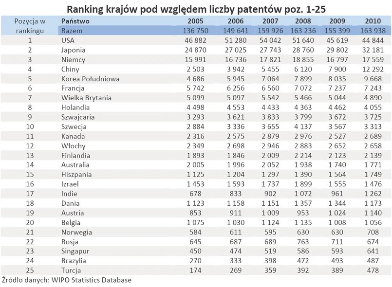 Polska znalazła się na 31. miejscu rankingu. Choć na pierwszy rzut oka wygląda to nie najgorzej, to od czołówki rankingu dzieli Polskę prawdziwa przepaść. Z Polski pochodzi zaledwie 199 patentów, czyli 0,12 proc. dorobku światowego. W porównywalnej pod względem liczby mieszkańców Hiszpanii uzyskano niemal dziewięć razy więcej patentów.