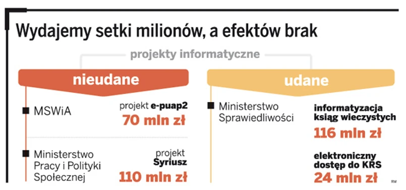 Na drugim biegunie jest Ministerstwo Sprawiedliwości. Sukcesem okazał się projekt e-wokandy, dzięki któremu do sądu wpłynęło już 1,5 mln spraw. Podobnie dobre opinie zbiera projekt przeniesienia do cyfrowej postaci ksiąg wieczystych – dziś dostępne w ten sposób jest ok. 60 proc. zbiorów.