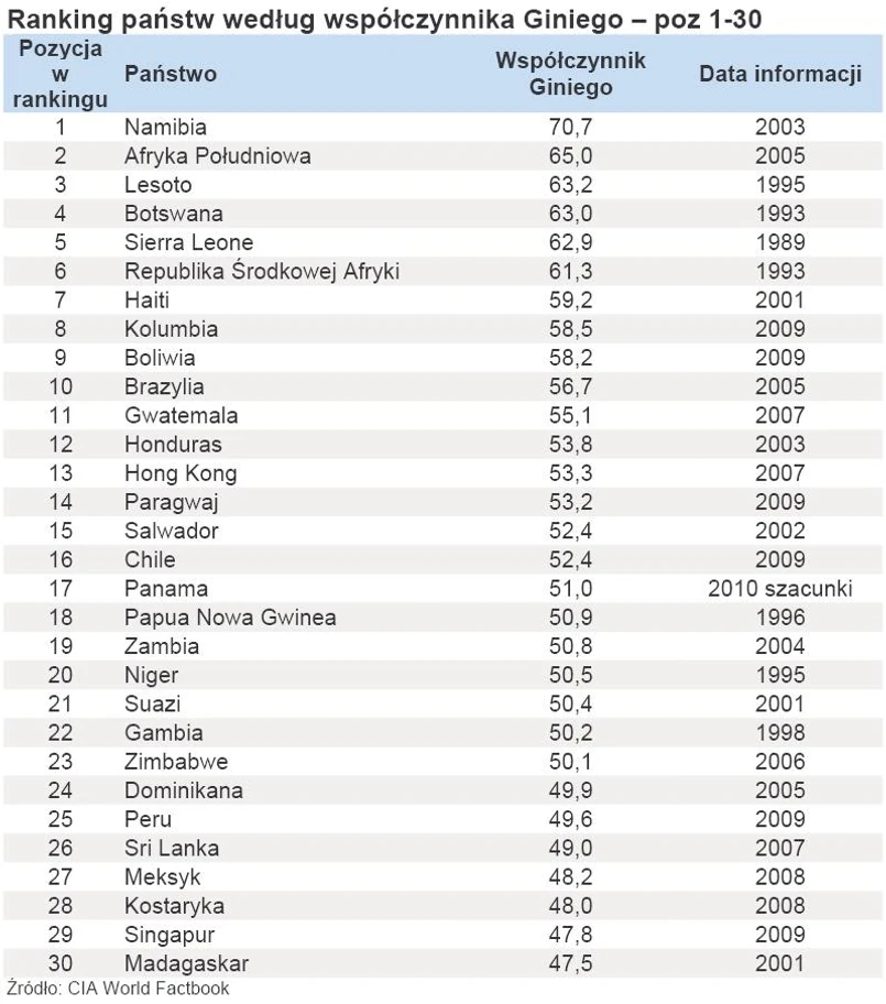 Wśród krajów o największym stopniu nierówności dominują państwa afrykańskie i latynoamerykańskie. Na czele rankingu znalazły się Namibia, RPA i Lesoto. Wysokie, 10. miejsce, zajęła Brazylia, kraj słynący z rozwarstwienia ekonomicznego społeczeństwa.
