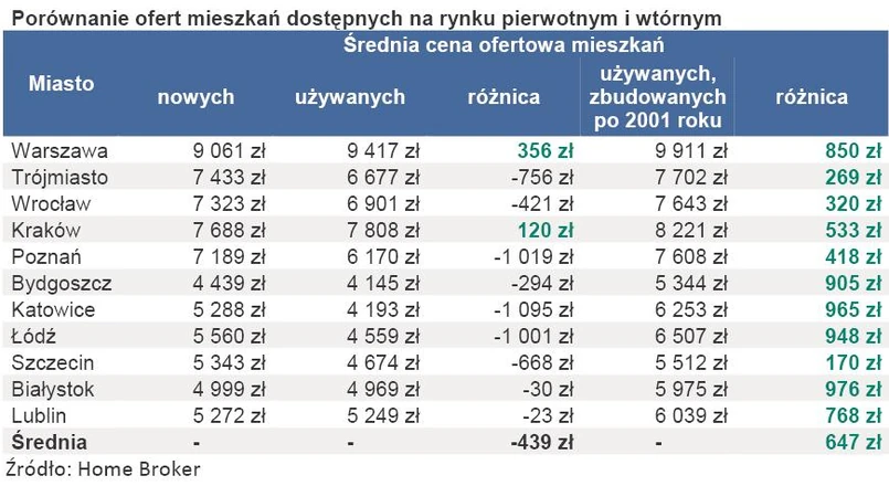 W Warszawie i Krakowie metr przeciętnego mieszkania używanego jest droższy niż nowego. Różnica średniej ceny ofertowej wynosi odpowiednio 356 i 120 zł za m kw. Trzeba jednak pamiętać, że na przykład standard mieszkań w budynkach z wielkiej płyty mocno odstaje od tego jaki znaleźć można w projekcie deweloperskim. Do porównań należałoby przyjąć więc lokale używane zbudowane w ostatniej dekadzie. Wtedy to różnica w cenie jest już znacznie wyższa. Przeciętnie w 11 badanych miastach wynosi ona 647 zł w przeliczeniu na m kw. Jest to kwota, za którą wykończenie mieszkania można zlecić firmie. W cenie tej otrzymać można podstawowy standard, chyba że prace wykończeniowe wykona właściciel własnoręcznie.