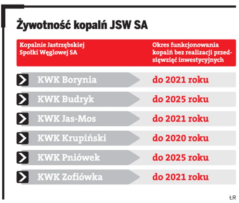 Może więc zamiast iść na potężną awanturę z silnymi związkowcami, zostawić jastrzębskie kopalnie samym sobie. Jeśli nie będzie w spółce inwestycji, nie będzie udostępniało się nowych złóż. Najmłodsza z nich, kopalnia Budryk, budowana w latach 70., a także kopalnia Pniówek mają szanse na przeżycie 14 lat, do roku 2025. Na tyle mają bowiem udostępnionych zasobów węgla. Trzy inne kopalnie: Borynia, Jas-Mos i Zofiówka mogą fedrować przez 10 lat, do 2021 roku. Najkrócej, bo do 2020 roku wydobywać będzie kopalnia Krupiński.