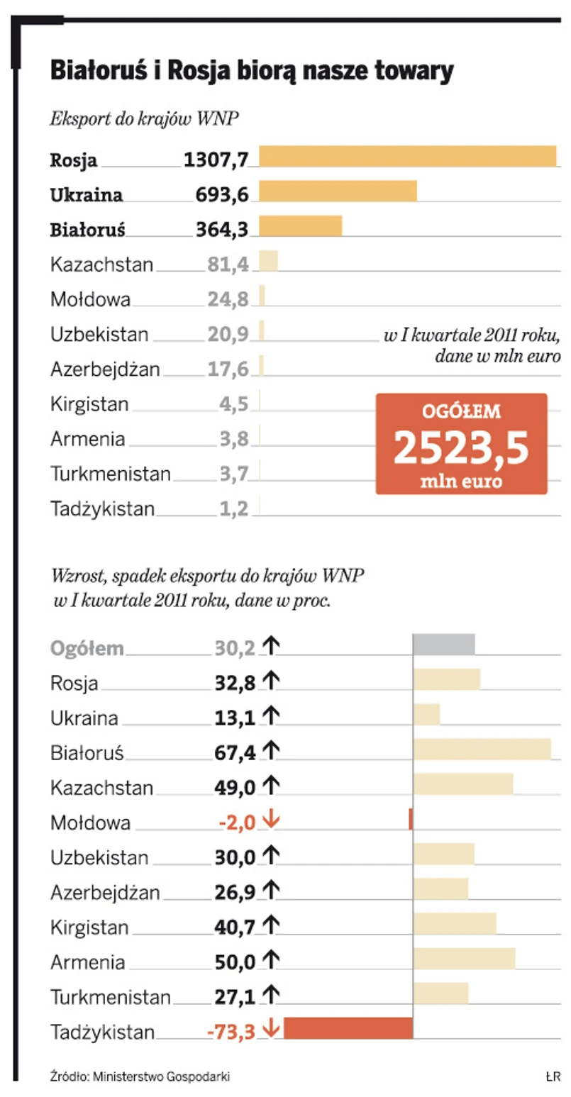 Polskie firmy odzyskują rynki wschodnie, po tym jak przed dwoma laty ich eksport do krajów Wspólnoty Niepodległych Państw (WNP) skurczył się w wyniku kryzysu aż o 38 proc. Zarówno w I kwartale tego roku, jak i w całym roku ubiegłym wzrost sprzedaży polskich towarów przekroczył tam 30 proc. – wynika z danych resortu gospodarki.