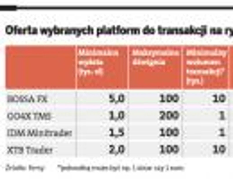 Różnice między poszczególnymi platformami sprowadzają się właściwie do wysokości minimalnej wpłaty, po dokonaniu której można zacząć grać. I tak na przykład TMS Brokers wymaga minimalnej wpłaty w wysokości 1 tys. zł, XTB Brokers – 2 tys. zł, a DM BOŚ – 5 tys. zł. Wszystkie platformy są bezpłatne, a jedynym kosztem dla inwestora jest spread, czyli różnica między kursem kupna a sprzedaży waluty lub towaru. Spready są najniższe na głównych walutach. Na przykład w handlu na euro i dolarze spready kształtują się na poziomie 2 pipsów, czyli setnych części grosza.