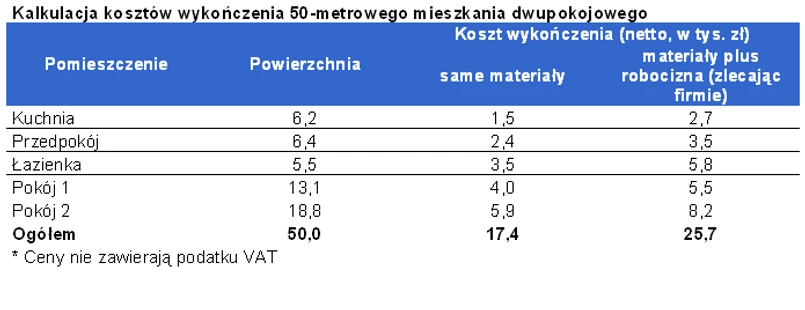 Koszt wykończenia metra mieszkania można więc oszacować na 556 zł brutto (515 zł netto) w przypadku zlecenia robót firmie. Wtedy obowiązywałaby bowiem 8-proc. stawka VAT. W przypadku zakupu materiałów wykończeniowych na własną rękę liczyć się należy z podstawową 23-proc. stawką podatku od towarów i usług. Fiskus pozwala na limitowane odzyskanie różnicy między obiema w/w stawkami. Ponadto w przypadku wykańczania mieszkania samodzielnie konieczny może okazać się także zakup lub wypożyczenie sprzętu. Można więc oszacować, że na wykonaniu prac samodzielnie można więc zaoszczędzić około 25% kosztów.