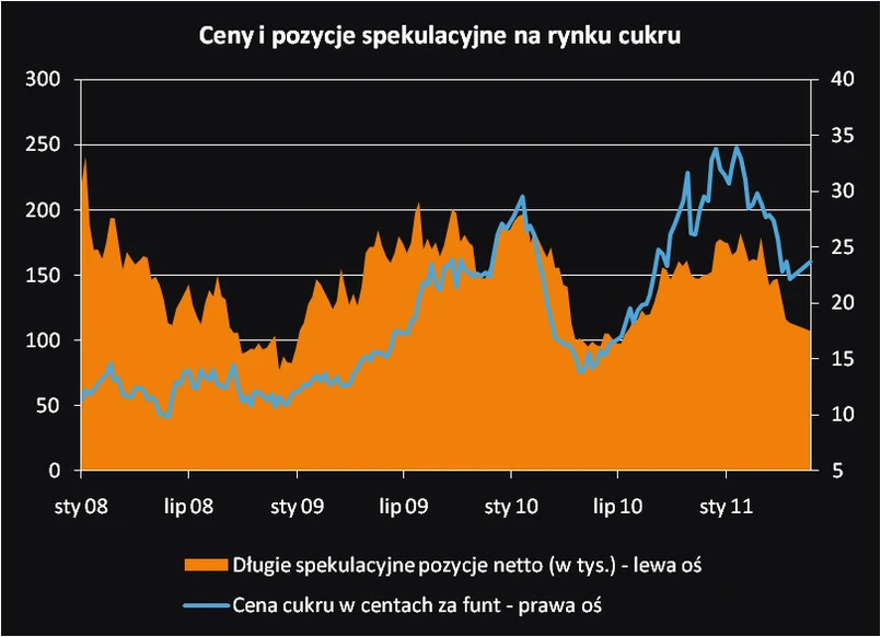 Ceny cukru na giełdach na całym świecie znajdują się w trendzie spadkowym od początku lutego bieżącego roku. Silne wzrosty zapoczątkowane w lipcu 2010r. (wywołane sytuacją pogodową m.in. w Pakistanie, Australii i Indiach) ustały w momencie pojawienia się informacji na temat większych niż oczekiwano zbiorów w Tajlandii (drugi największy eksporter surowca na świecie) oraz pierwszych sygnałów na temat zwiększenia kwot eksportowych przez Indie (drugi po Brazylii największy producent cukru).