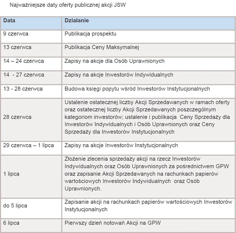 Inwestorzy indywidualni mogą składać zapisy na akcje JSW od 14 do 27 czerwca 2011 r. w Punktach Obsługi Klienta firm inwestycyjnych w całej Polsce. Zapisy będą przyjmowane po cenie maksymalnej, która zostanie podana do publicznej wiadomości 13 czerwca 2011 r. Tego samego dnia rozpocznie się budowa księgi popytu wśród inwestorów instytucjonalnych, która potrwa do 28 czerwca. Debiut akcji planowany jest na 6 lipca 2011 r.