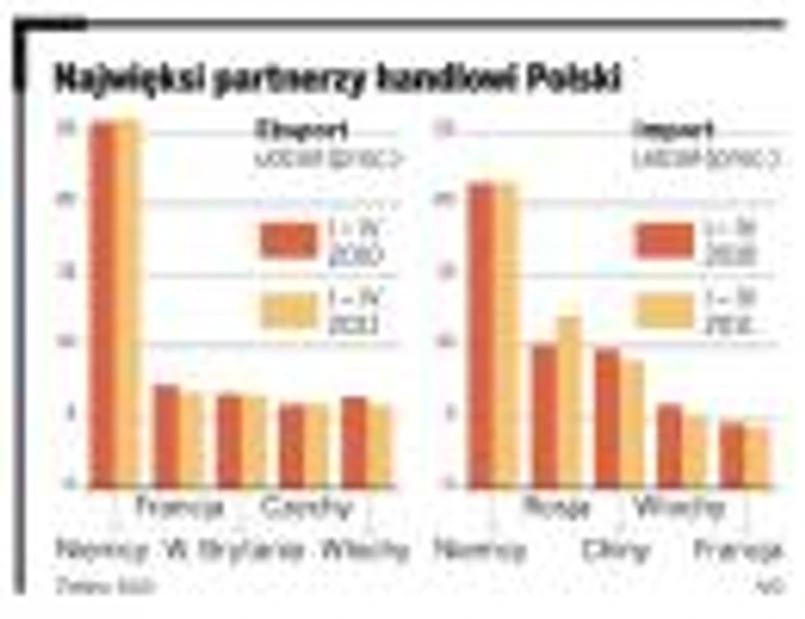 Jeżeli chodzi o import, to najwięcej towarów przywozimy z Niemiec – ich udział wynosi 21,5 proc. Zmiana nastąpiła na drugiej i trzeciej pozycji – Rosja wyprzedziła Chiny. Jej udział przez rok wzrósł do 12,2 proc., podczas gdy Państwa Środka spadł do 9 proc. – Wzrost pozycji Rosji związany jest przede wszystkim ze wzrostem cen surowców energetycznych, a nie naszego popytu na towary z tego rynku – wyjaśnia Jacek Adamski.