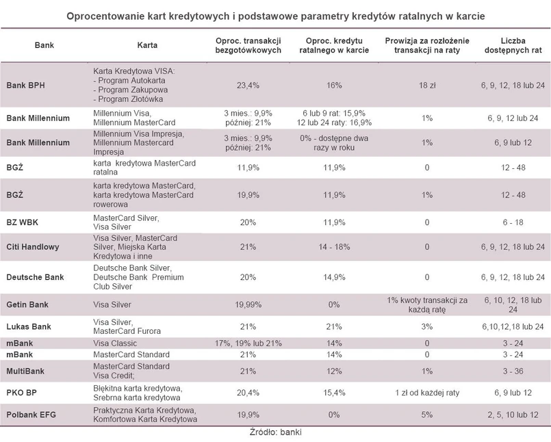 Klienci mogą nawet znaleźć oferty trzech instytucji, które mają zerowe oprocentowanie kredytu ratalnego w karcie, choć każdorazowo opatrzone jest to dodatkową prowizją. Bank Millennium na karcie kredytowej Impresja za cenę 1 proc. prowizji pozwala dwa razy w roku kalendarzowym rozłożyć na raty transakcje o wartości od 300 do 3 tys. zł. Getin Bank również nie pobiera odsetek, ale w zamian klient jest obarczony prowizją (1 proc.) za każdą ratę. Z kolei w Polbanku ceną za zerowe oprocentowanie jest prowizja w wysokości 5 proc., która również jest rozkładana na raty. Rozwiązanie Banku Millennium i Polbanku cenowo wypada najkorzystniej wśród dostępnych na rynku kredytów w karcie. Z kolei najdrożej jest w Lukas Banku, który oprócz 21 proc. odsetek pobiera jeszcze 3 proc. prowizji. Na uwagę zasługuje również karta ratalna z Banku BGŻ, gdzie na kredyt z comiesięcznymi ratami automatycznie zamieniana jest każda transakcja.