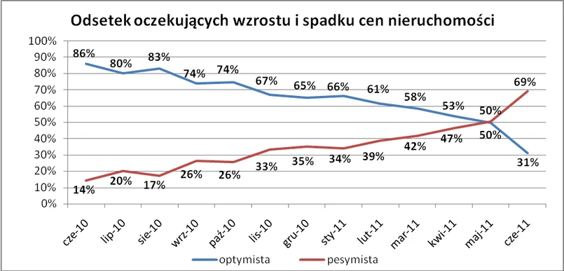 W czerwcu po raz piąty z rzędu pogorszyła się relacja optymistów do pesymistów, czyli oczekujących wzrostu i spadku cen mieszkań w największych miastach Polski. Bieżący miesiąc przyniósł zwiększenie grona pesymistów aż o 19 pp. Obecnie stanowią oni 69% badanych. W maju było to niewiele ponad 50 proc.. Bieżący wynik jest więc drugim, w którym grono osób przewidujących spadek cen mieszkań, było liczniejsze niż osób o odmiennym zdaniu. Obok rekordowej podaży lokali, coraz częściej pojawiającym się wytłumaczeniem takich prognoz jest ograniczenie programu „Rodzina na Swoim”. – Dla wielu kupujących cena mieszkania pozwalająca na dopłatę jest obok lokalizacji najistotniejszym kryterium jakie ma spełniać nieruchomość. Koniec programu dofinansowania może spowodować, że mieszkania, których głównym atutem jest dziś możliwość otrzymania dopłaty przestaną być atrakcyjne – tłumaczy Artur Lepiarz, doradca Home Broker z Lublina.