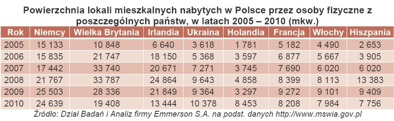 Warto zaznaczyć, że przystąpienie Polski do Unii Europejskiej nie spowodowało od razu znacznego wzrostu zainteresowania naszymi nieruchomościami. Jak widać z tabeli wzmożony ruch rozpoczął się w 2006 roku. Od tamtej pory zarówno powierzchnia, jak i liczba mieszkań nabywanych przez cudzoziemców w naszym kraju znacznie się zwiększyła.