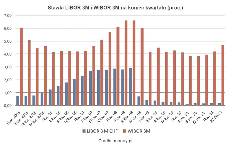 Kurs franka na tyle jednak poszybował w górę, że nie pomaga już zadłużonym w tym walucie bliska zera wysokość stóp procentowych w Szwajcarii versus całkiem spore stopy w Polsce. Gdy LIBOR 3M w CHF wynosi 0,18 proc. to WIBOR 3M sięga od poniedziałku 4,69 proc.