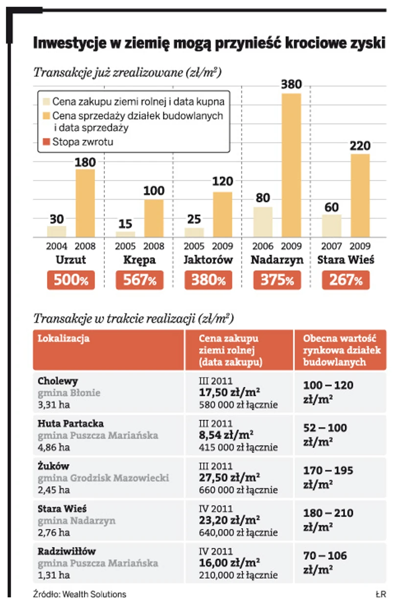 Na największe zyski można liczyć, kupując ziemię niedaleko dużych miast – 20 – 60 kilometrów od ich centrów, w pobliżu tak zwanych miejscowości satelickich – radzą eksperci. – Wokół Warszawy najbardziej atrakcyjne lokalizacje pod inwestycje można znaleźć od strony południowo-zachodniej, w okolicach Żyrardowa, Grodziska Mazowieckiego, Grójca. A od wschodu – Mińska czy Otwocka – mówi Radosław Brodaczewski, analityk z departamentu gruntów ogólnokrajowych Home Broker.