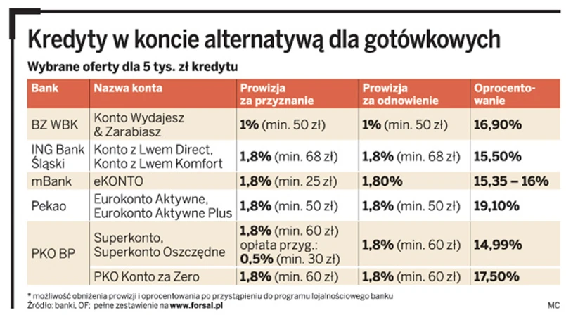 Oferta reklamowa pożyczek gotówkowych aż roi się od kredytów z oprocentowaniem nominalnym nawet poniżej 10 proc. w skali roku. Przeciętne oprocentowanie kredytów odnawialnych dla limitu 5 tys. zł w standardowych kontach bankowych sięga 16 proc. Jednak po dodaniu wysokich prowizji i często obowiązkowych ubezpieczeń koszt pożyczki gotówkowej może być nieporównywalnie wyższy niż kredytu w koncie. Ten oczywiście też obarczony jest prowizją, ale z reguły nie przekracza ona 2 proc. rocznie (na taki okres uruchamiany jest limit zadłużenia w rachunku).