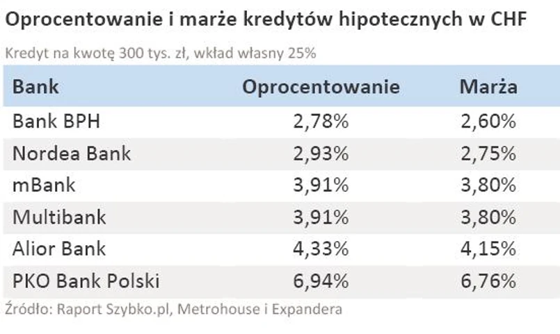 Analitycy podkreślają, że mimo rosnącego kursu franka, niewiele działo się w zakresie ofert kredytów we frankach. Marże i oprocentowanie pozostawały na stabilnym poziomie. Najatrakcyjniejszą ofertę kredytów w szwajcarskiej walucie ma Bank BPH, który kusi klientów oprocentowanie 2,78 proc. i marżą 2,60 proc.