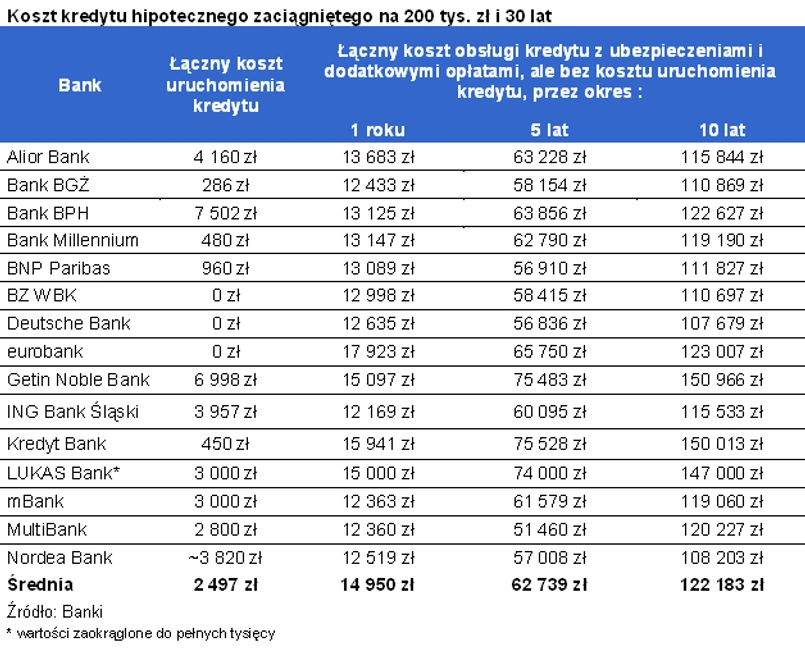 Przytoczone powyżej warunki kredytowe nie przedstawiają jednak kompleksowo wszystkich kosztów związanych z obsługą i zaciągnięciem długu. Na początku oprócz prowizji za udzielenie kredytu trzeba bowiem często opłacić podatek od ustanowienia hipoteki, ubezpieczenie pomostowe, opłaty za stosowny wpis do księgi wieczystej, ubezpieczenie nieruchomości czy na przykład zapłacić za jej wycenę. Niektóre banki zaproponowałyby w rozważanym przypadku, aby część z tych opłat powiększyła wartość kredytu. W efekcie, aby uruchomić kredyt na kwotę 200 tys. zł, modelowa rodzina musi liczyć się ze średnim kosztem na poziomie 2,5 tys. zł. Nie oznacza to jednak, że na rynku nie można znaleźć ofert bez kosztów uruchomienia. Na przykład BZ WBK, Eurobank i Deutsche Bank deklarują, że przy uruchomieniu kredytu nie pobiorą żadnej opłaty od kredytobiorcy. Po drugiej stronie barykady znajduje się Bank BPH. W jego przypadku koszt uruchomienia przyjętego kredytu wynosi aż 7502 zł. Trzeba tu podkreślić, że podniesienie salda kredytu o koszty jego uruchomienia podnosi comiesięczną ratę. W efekcie przez 30 lat obsługi długu kredytobiorca poniesie koszt prowizji w przynajmniej podwójnej wysokości.