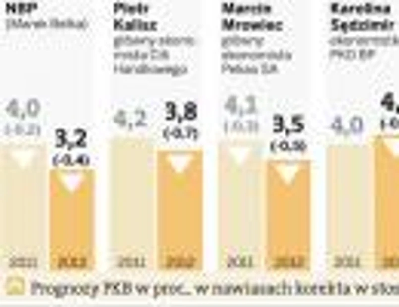 Dlatego na przyszły rok ekonomiści wróżą znaczne spowolnienie wzrostu. Z uśrednionej prognozy wynika, że wyniesie on 3,71 proc. Najbardziej pesymistyczny jest NBP, który przewiduje wzrost na poziomie 3,2 proc. Spowolnienie wzrostu sygnalizuje także sam rząd. W ustawie budżetowej zapisano m.in., że w związku z zaplanowanymi działaniami konsolidacyjnymi w sferze finansów publicznych oczekuje się ograniczenia tempa wzrostu spożycia publicznego, czego konsekwencją będzie zerowy wpływ tej kategorii ekonomicznej na wzrost PKB. Dodatkowo w wyniku zakończenia cyklu inwestycyjnego publicznych projektów infrastrukturalnych, których kumulacja powinna mieć miejsce w 2011 r., w 2012 r. trzeba też, zdaniem resortu finansów, oczekiwać ograniczenia wartości inwestycji publicznych. A to będzie oznaczać, że wkład we wzrost PKB ze strony łącznego popytu generowanego przez sektor rządowy i samorządowy będzie ujemny – ok. minus 0,6 pkt proc. w porównaniu z plus 1,8 pkt proc. w 2011 r.