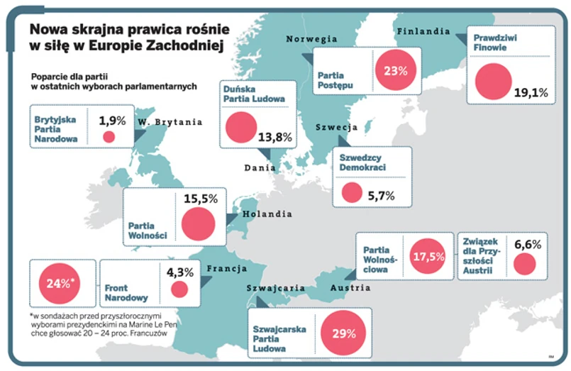 Wystarczy rzut oka na polityczną mapę zachodniej Europy, by zauważyć, że zalegalizowana wolą wyborców obecność silnych ruchów politycznych łączących hasła antyimigranckie, eurosceptyczne i antyglobalizacyjne nie jest już odosobnionym fenomenem. Nie dalej jak w kwietniu partia Prawdziwych Finów zgarnęła 19,1 proc. głosów, stając się trzecią siłą w parlamencie Kraju Tysiąca Jezior, a jej lider Timo Soini zebrał najwięcej głosów ze wszystkich kandydatów w całej Finlandii. Z kolei latem 2010 r. Partia Wolności (PVV) charyzmatycznego Geerta Wildersa uzyskała poparcie 15 proc. głosujących Holendrów, stając się języczkiem u wagi, od którego zależy układ sił w haskim parlamencie. To nie koniec. Silne partie nawołujące do zaostrzenia