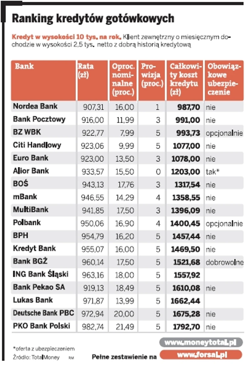 Zwycięzca najnowszego rankingu kredytów gotówkowych przygotowanego wspólnie z TotalMoney jest Nordea. Bank ma wysokie oprocentowanie nominalne w wysokości 16 proc., ale oprócz 1-proc. prowizji nie nalicza żadnych dodatkowych kosztów w postaci innych opłat i ubezpieczeń. Pożyczając 10 tys. zł na rok, klient zewnętrzny, czyli taki, który nie ma w banku konta, musi zwrócić kwotę tylko o 987 zł wyższą. Miesięczna rata wynosi zaledwie 907 zł.