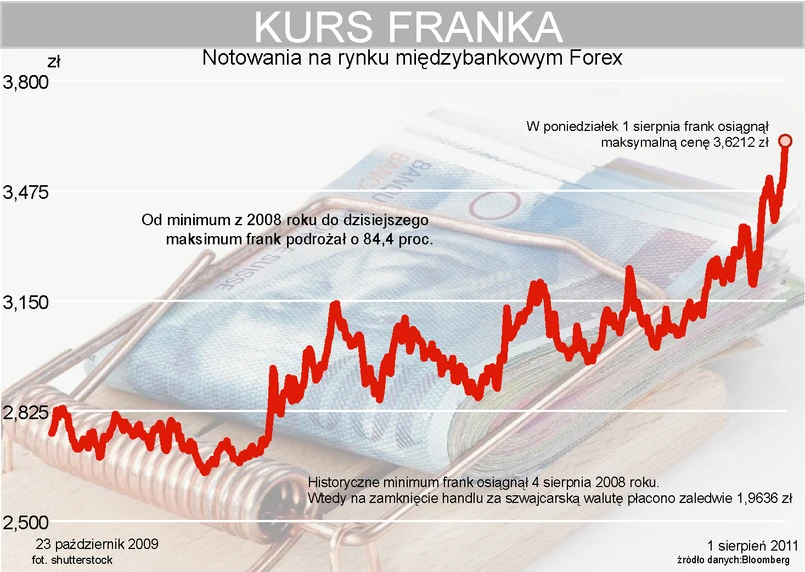 Wczoraj o godz. 16 pojawiły się dane o indeksie ISM dla amerykańskiego przemysłu. Spadł do poziomu 50,9 pkt, gdy eksperci oczekiwali 54,9 pkt. Spowodowało to gwałtowną reakcję rynku, który już wcześniej oczekiwał nerwowo na wieczorne głosowania w Kongresie USA w sprawie zwiększenia limitu zadłużenia. – Sytuacja jest tak napięta, że już nie potrzeba dramatycznych informacji, wystarczą złe. A frank jest bezpieczną przystanią – wyjaśnia Marcin Turkiewicz, szef dilerów walutowych BRE. Dlatego także euro było wczoraj najsłabsze w historii. Płacono za nie jedynie 1,1 franka. Osłabiło się o ponad 3 proc.