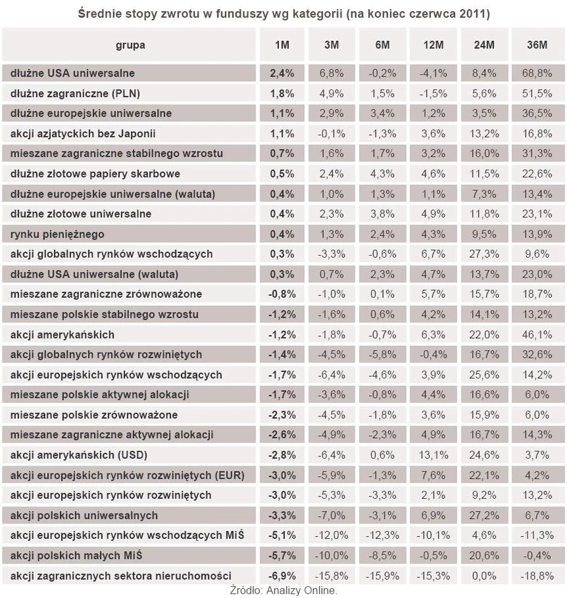 Przy słabości funduszy akcyjnych oraz mieszanych osłabienie złotego względem EUR (o 0,65 proc. wg kursu średniego NBP) i USD (o 2,15 proc.) spowodowało, że na szczycie tabeli z wynikami uplasowały się fundusze papierów dłużnych denominowanych w tych właśnie walutach. Najwyższą średnią stopę zwrotu przyniosły więc fundusze dłużne dolarowe (2,4 proc.), dłużne zagraniczne (1,8 proc.) oraz dłużne europejskie uniwersalne (1,1 proc.).