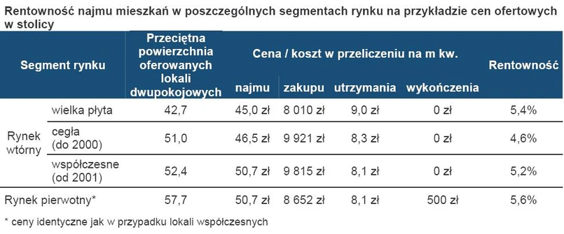 Potencjalne zyski z wynajmu w dużym stopniu zależą od technologii w jakiej został wzniesiony budynek. To ona wpływa bowiem na cenę zakupu nieruchomości. Wbrew pozorom na rynku najmu wpływ technologii budowy na cenę nie jest aż tak znaczący. Właśnie dlatego potencjalna rentowność najmu mieszkań w budynkach z wielkiej płyty jest wyższa niż w przypadku budownictwa współczesnego i to pomimo wyższych kosztów utrzymania tego pierwszego. Przeciętna cena ofertowa sprzedaży mieszkania w warszawskim budynku z wielkiej płyty wynosi 8010 zł za m kw., a najmu 45 zł miesięcznie. Uwzględniając koszty utrzymania na poziomie 9 zł za m kw. można oszacować rentowność na poziomie 5,4%. Jest to najwyższy wynik w wyodrębnionych segmentach rynku wtórnego. Trzeba jednak zaznaczyć, że uproszczone szacunki nie uwzględniają podatków, opłat za użytkowanie wieczyste czy okresów niewynajęcia. Ponadto obszar analizy zawężono do Warszawy jako najlepiej rozwiniętego i największego rodzimego rynku nieruchomości.