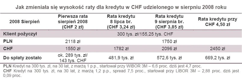 Dla klientów, którzy zaciągali kredyty we frankach przed trzema laty, kurs szwajcarskiej waluty właśnie podwoił swoją wartość, bo gdy na początku sierpnia 2008 roku brali kredyt, kupowali walutę poniżej 2 zł, a teraz kurs sięga już 4 zł. W bardzo aktywnym na tym rynku banku Nordea kurs kupna franka 8 sierpnia 2008 roku wynosił 1,94 zł. Dziś rata spłacana jest po kursie sprzedaży wynoszącym 3,983 zł. W DB PBC kurs kupna wynosił przed trzema laty 1,9752 zł, dziś spłata odbywa się przy notowaniach 3,96 zł. Z kolei w Millennium z 1,959 zł zrobiło się 3,954 zł. W PKO BP kurs przekroczył już 4 zł i wynosi 4,03 zł. Efekt? Na każde 100 tys. zł kredytu zaciągniętego we franku trzy lata temu rata w ciągu miesiąca wzrosła o 100 zł.