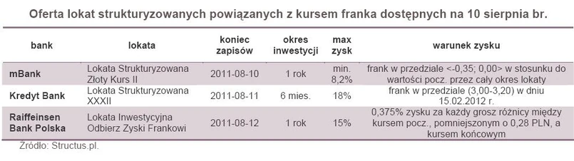 Wg stanu na środę 10 sierpnia br. klienci mieli do wyboru trzy struktury oparte na kursie franka szwajcarskiego. Taką możliwość dają Kredyt Bank, mBank i Raiffeisen Bank Polska. Ale sygnał do ataku dał 18 lipca br. ING Bank Śląski, który zaoferował Inwestycyjny Plan Ubezpieczeniowy – DILT 037 Stawiam na Spadek CHF. Jest to roczna struktura zakładająca spadek kursu franka wobec złotego, na której będzie można zarobić do 8,1 proc., a zysk ten będzie zwolniony z 19-proc. podatku od zysków kapitałowych. Na koniec klienci otrzymają zwrot zainwestowanego kapitału plus premię równą procentowemu spadkowi kursu CHF/PLN publikowanego przez serwis Reuters (porównywane są wartości z początku i z końca inwestycji). Jednak zysk maksymalny może wynieść 8,1 proc., jeśli kurs franka spadnie więcej, wzrost oprocentowania zostanie zatrzymany.