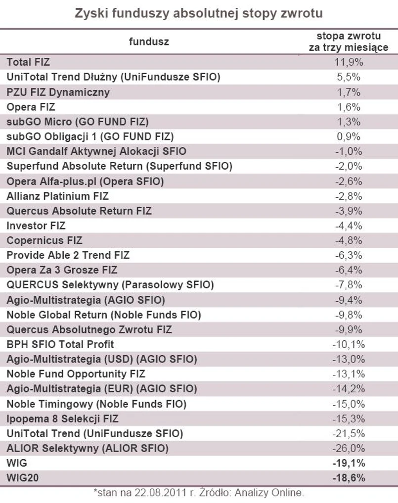Propozycją towarzystw funduszy inwestycyjną na trudne i niepewne czasy są fundusze absolutnej stopy zwrotu. Z definicji dążą one do wypracowania bezwzględnego zysku, niezależnie od bieżących trendów rynkowych. Mówiąc krótko, takie fundusze stawiają sobie za cel wypracowanie z powierzonego kapitału przynajmniej kilkuprocentowego dochodu w każdych warunkach. Należy jednak pamiętać, że jest to tylko cel, którego wcale nie muszą osiągnąć.