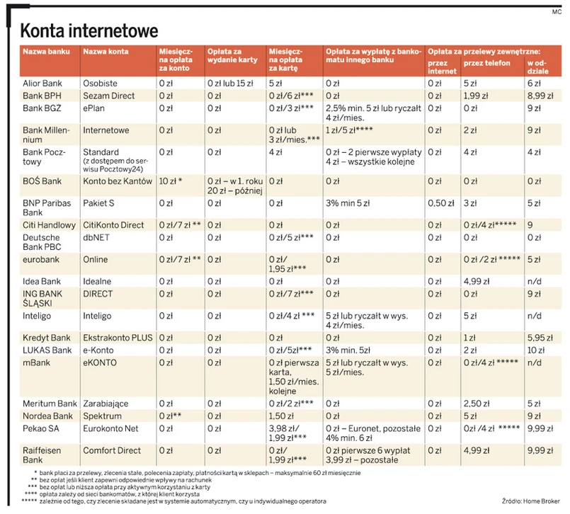 W Alior Banku trzeba więc np. zapłacić 15 zł za wydanie wypukłej karty płatniczej, a potem co miesiąc 5 zł. W BOŚ karta za darmo jest w pierwszym roku, a w kolejnych kosztuje 20 zł rocznie. Przy kontach internetowych, podobnie jak przy tradycyjnych rachunkach, mogą się też pojawić opłaty za przelewy zlecane przez telefon i w oddziale banku. Taki przelew może kosztować nawet 10 zł. Za to niemal wszystkie przelewy zlecane w sieci są darmowe. Wyjątkiem jest pakiet S BNP Paribas, w którym taki przelew kosztuje 0,5 zł.