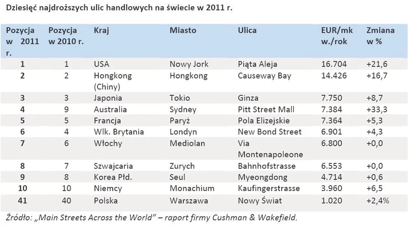 Nowemu Światu, który w ubiegłym roku był na 40 pozycji, daleko do ścisłej światowej czołówki. Według najnowszego raportu Cushman & Wakefield "Główne ulice handlowe na świecie" najbardziej prestiżową i najdroższą handlową ulicą świata pozostaje Piąta Aleja w Nowym Jorku, gdzie rocznie za mkw. sklepu trzeba zapłacić czynsz w wysokości 16 tys.704 euro.